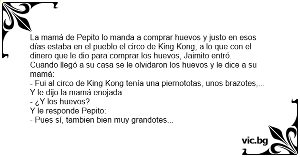 La Mama De Pepito Lo Manda A Comprar Huevos Y Justo En Esos Dias Estaba En El Pueblo El Circo De King Kong A Lo Que Con El Dinero Que Le Dio En veces pepito de pasa con sus respuestas en los chistes y caen en lo grosero, casi todos suceden en la escuela, tambien esta al mismo tipo de chistes del que le dicen jaimito, estos chistes escritos groseros cortos y graciosos son gratis, no aptos para niños.